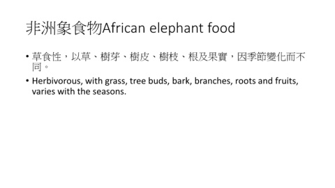 非洲象食物African elephant food • 草食性,以草、樹芽、樹皮、樹枝、根及果實,因季節變化而不 同。 • Herbivorous, with grass, tree buds, bark, branches, roots and fruits, varies with the seasons.
