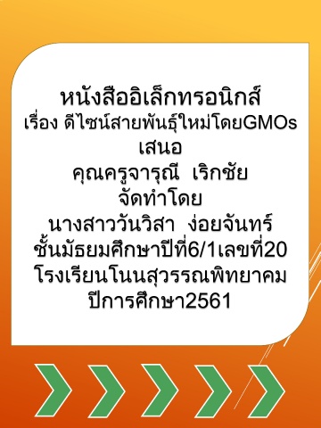 หนังสืออิเล็กทรอนิกส์ เรื่อง ดีไซน์สายพันธุ์ใหม่โดยGMOs เสนอ คุณครูจารุณี เริกชัย จัดท าโดย นางสาววันวิสา ง่อยจันทร์ ชั้นมัธยมศึกษาปีที่6/1เลขที่20 โรงเรียนโนนสุวรรณพิทยาคม ปีการศึกษา2561