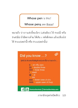 Whose pen is this? Whose pens are these? หมายถึง ปากกาแท่งนี้ของใคร (แท่งเดียว) ใช้ this(นี่) หรือ that(นั่น) ถ้ามีหลายด้าม ให้เติม s หลังสิ่งของ แล้วเปลี่ยนไป ใช้ these(เหล่านี้) หรือ those(เหล่านั้น) ภาษาอังกฤษง่ายนิดเดียว 123