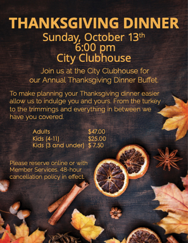 Join us at the City Clubhouse for our Annual Thanksgiving Dinner Buffet.