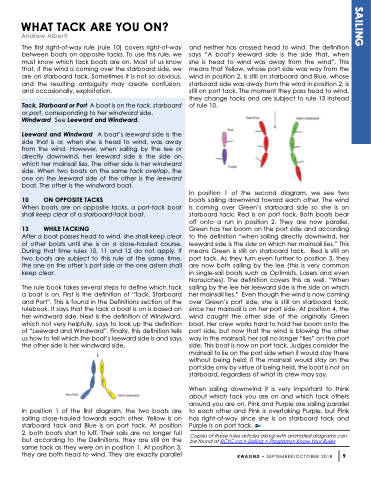 After a a a a a a boat passes head to wind she shall keep clear of other boats until she is on a a a close-hauled course During that time rules 10 11 and 12 do not apply If two boats are subject to this rule at at the same time the the the the one one on on on the the the the other’s port side or or the the the the one one astern shall keep clear The rule book takes several steps to define which tack a a a a a boat is is on on First is is the definition of “Tack Starboard and Port” This is is found in fin the the Definitions section of the the rulebook It says that the tack a a a a a a boat is is on on is is based on on her windward side Next is the definition of Windward which not very helpfully says to look up the definition of “Leeward and Windward” Finally this definition tells us how to tell which the boat’s leeward side is and says the the other side side is her her windward side side In position 1 of the the first diagram the the two boats are sailing close-hauled towards each other Yellow is on starboard tack tack and Blue is on on port tack tack At position 2 both boats start to luff Their sails are no longer full but according to the the the Definitions they are still on on the the the same tack as they were on on on in position position 1 At position position 3 they are are both head to wind They are are exactly parallel SAILING