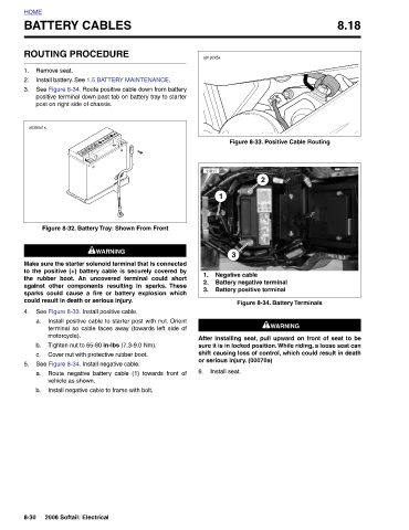BATTERY CABLES ROUTING PROCEDURE Install battery. See 1.5 BATTERY MAINTENANCE. See Figure 8-34. Route positive cable down from battery positive terminal down past tab on battery tray to starter post on right side of chassis. Figure 8-32. Battery Tray: Shown From Front 1WARNING 1WARNING Make sure the starter solenoid terminal that is connected to the positive (+) battery cable is securely covered by the rubber boot. An uncovered terminal could short against other components resulting in sparks. sparks could cause a fire or battery explosion which could result in death or serious injury. See Figure 8-33. Install positive cable. Install positive c