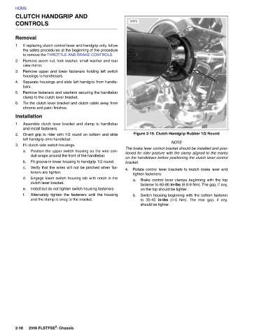 CLUTCH HANDGRIP AND If replacing clutch control lever and handgrip only, follow the safety procedures at the beginning of the procedure to remove the THROTTLE AND BRAKE CONTROLS. Remove acorn nut, lock washer, small washer and rear Remove upper and lower fasteners holding left switch housings to handlebars. Separate housings and slide left handgrip from handle- Remove fasteners and washers securing the handlebar clamp to the clutch lever bracket. Tie the clutch lever bracket and clutch cable away from chrome and paint finishes. Assemble clutch lever bracket and clamp to handlebar and install fasteners. Orient grip to rider with 1/2 round on bottom