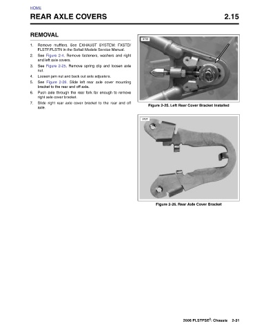 REAR AXLE COVERS Remove mufflers. See EXHAUST SYSTEM: FXSTD/ FLSTF/FLSTN in the Softail Models Service Manual. See Figure 2-4. Remove fasteners, washers and right and left axle covers. See Figure 2-25. Remove spring clip and loosen axle Loosen jam nut and back out axle adjusters. Slide left rear axle cover mounting Figure 2-26. bracket to the rear and off axle. Push axle through the rear fork far enough to remove right axle cover bracket. Slide right rear axle cover bracket to the rear and off