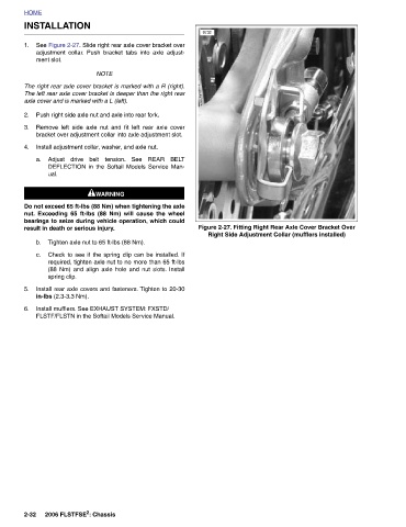 NOTE The right rear axle cover bracket is marked with a R (right). The left rear axle cover bracket is deeper than the right rear Push right side axle nut and axle into rear fork. Remove left side axle nut and fit left rear axle cover bracket over adjustment collar into axle adjustment slot. Install adjustment collar, washer, and axle nut. Adjust drive belt tension. See REAR BELT DEFLECTION in the Softail Models Service Man- 1WARNING 1WARNING Do not exceed 65 ft-lbs (88 Nm) when tightening the axle nut. Exceeding 65 ft-lbs (88 Nm) will cause the wheel bearings to seize during vehicle operation, which could Tighten axle nut to 65 ft-lb