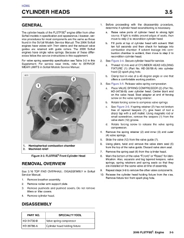 CYLINDER HEADS The cylinder heads of the FLSTFSE 2 engine differ from other Softail models in specification and appearance. However, ser- vice procedures for most components are the same as those found in the Softail Models Service Manual. The 2006 Softail engines have valves with 7mm stems and the exhaust valve guides are retained with guide collars. engines have single valve springs. Because of these differ- ences follow the service instructions in this supplement. For valve spring assembly specification see Table 3-2 in this Supplement. For service wear limits, refer to SERVICE WEAR LIMITS in Softail Models Service Manual. 1 Hemispherical combu