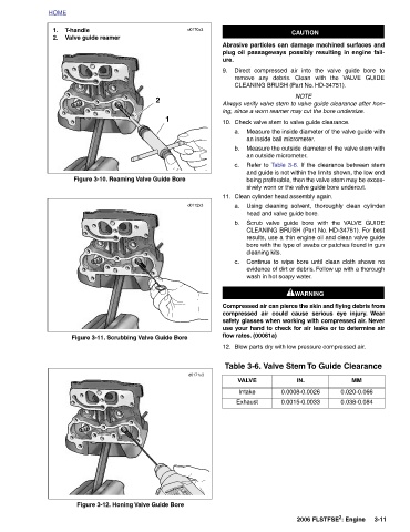 CAUTION Abrasive particles can damage machined surfaces and plug oil passageways possibly resulting in engine fail- Direct compressed air into the valve guide bore to NOTE Always verify valve stem to valve guide clearance after hon- Measure the inside diameter of the valve guide with Measure the outside diameter of the valve stem with Table 3-6. If the clearance between stem and guide is not within the limits shown, the low end being preferable, then the valve stem may be exces- sively worn or the valve guide bore undercut. Using cleaning solvent, thoroughly clean cylinder CLEANING BRUSH (Part No. HD-34751). For best results, use a thin engine oi