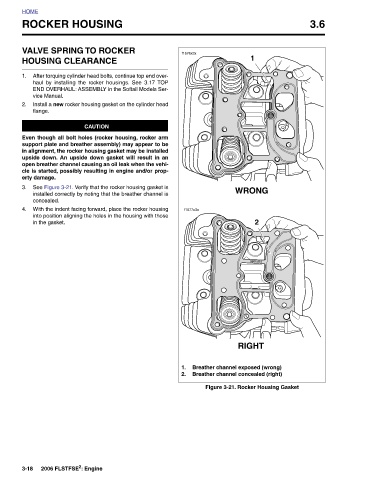 ROCKER HOUSING VALVE SPRING TO ROCKER HOUSING CLEARANCE After torquing cylinder head bolts, continue top end over- haul by installing the rocker housings. See 3.17 TOP END OVERHAUL: ASSEMBLY in the Softail Models Ser- Install a new rocker housing gasket on the cylinder head CAUTION Even though all bolt holes (rocker housing, rocker arm support plate and breather assembly) may appear to be in alignment, the rocker housing gasket may be installed upside down. An upside down gasket will result in an open breather channel causing an oil leak when the vehi- cle is started, possibly resulting in engine and/or prop- See Figure 3-21. Verify that the rock