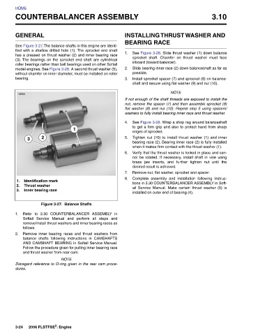 BEARING RACE See Figure 3-28. Slide thrust washer (1) down balance sprocket shaft. Chamfer on thrust washer must face inboard (toward balancer). Slide bearing inner race (2) down balanceshaft as far as Install sprocket spacer (7) and sprocket (8) on balance- shaft and secure using flat washer (9) and nut (10). NOTE If not enough of the shaft threads are exposed to install the nut, remove the spacer (7) and then assemble sprocket (8) flat washer (9) and nut (10). Repeat step 5 using spacers/ washers to fully install bearing inner race and thrust washer. See Figure 3-28. Wrap a shop rag around balanceshaft to get a firm grip and also to prot