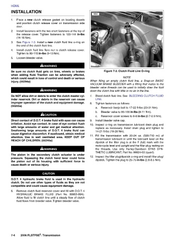 INSTALLATION Place a new clutch release gasket on locating dowels and position clutch release cover on transmission side Install fasteners with the two short fasteners at the top of the release cover. Tighten fasteners to 120-144 in-lbs (14-16 Nm). See Figure 7-3. Install a new clutch fluid line o-ring on the end of the clutch fluid line. Install clutch fluid line flare nut to clutch release cover. Tighten to 80-115 in-lbs (9-13 Nm). Loosen bleeder valve. 1WARNING 1WARNING Be sure no clutch fluid gets on tires, wheels or brakes when adding fluid. Traction can be adversely affected, which could result in loss of control and death or serious 1WARNING 1W