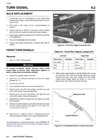 TURN SIGNAL BULB REPLACEMENT Locate latch slot on circumference of turn signal lamp smoked lens. Press in with small screw driver or coin to remove lens. Push bulb in and rotate 1/4 turn counterclockwise to Inspect contacts in socket. If necessary, clean contacts with a small wire brush and electrical contact cleaner. Evenly apply dielectric grease to the contacts and bottom of the new bulb. Push and rotate new bulb into socket. Snap-in and rotate smoked lens to position latch slot on FRONT TURN SIGNALS See 2.16 SEAT. Remove seat. 11WARNING 1WARNING prevent accidental vehicle start-up, which could cause death or serious injury, disconnect ne