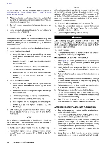 NOTE For instructions on crimping terminals, see APPENDIX B- WIRING AMP MULTILOCK ELECTRICAL CONNECTORS in Attach mechanics wire to socket terminals and carefully pull ends of mechanics wire to draw socket terminals and Carefully remove mechanics wire to avoid damage to ter- Install terminals into socket housing. For correct terminal NOTE Replacement turn signals and socket assemblies may have turn signal wires with color code different from that shown in Table 8-1. Check pin half of connector [31A] to determine Loosely install housings over lever brackets and clamp. Assemble right turn signal bracket (11) to mirror and small washer with new lock wa