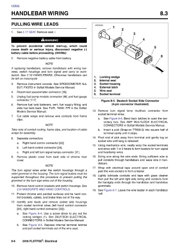 3 Remove turn signal lamp multilock connector from a. See Figure 8-6. Bend back latches to open the sec- ondary lock. See AMP MULTILOCK ELECTRICAL CONNECTORS in Softail Models Service Manual. Insert a pick (Snap-on TT600-3) into square half of Pivot end of pick away from terminal and gently tug on Using mechanics wire, neatly wrap the socket terminals and wires with 1 or 2 twists to form leaders for turn signal String wire along the wire ends. String sufficient wire to pull conduits through handlebars and leave wire in han- Wrap with electrical tape around open end of conduit Lightly lubricate