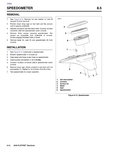SPEEDOMETER See Figure 8-12. Remove nut and washer (1) and lift console (2) from fuel tank. Position clean shop rags on fuel tank and flip console over to expose underside. Depress connector tab and disconnect 12-place harness connector [39] from speedometer under console. Remove three screws securing speedometer. screws are accessible from underside of console. Screws engage threaded holes in bezel. Remove bezel (4), seal (5) and speedometer (6) from INSTALLATION See Figure 8-12. Install seal to speedometer. Position speedometer in console (2). Align bezel with three screw holes on speedometer. Install screws and tighten to 35-45 in-lbs. Con