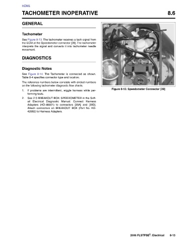GENERAL Tachometer See Figure 8-13. The tachometer receives a tach signal from the ECM at the Speedometer connector [39]. The tachometer interprets the signal and converts it into tachometer needle DIAGNOSTICS Diagnostic Notes See Figure 8-14. The Tachometer is connected as shown. Table 8-4 specifies connector type and location. The reference numbers below correlate with circled numbers on the following tachometer diagnostic flow charts. If problems are intermittent, wiggle harness while per- forming tests. See 2.5 BREAKOUT BOX: SPEEDOMETER in the Soft- ail Electrical Diagnostic Manual. Connect Harness Adapters (HD-46601) to connectors [39
