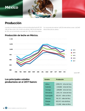La producción de leche en México en el mes de diciembre fue de 991,199 Con una producción total de 11,807,556 miles de litros contra 11,607,495