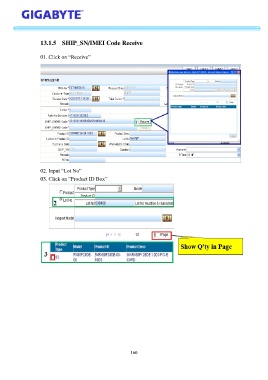 13.1.5 SHIP_SN/IMEI Code Receive 01. Click on “Receive” 02. Input “Lot No” 03. Click on “Product ID Box” 160
