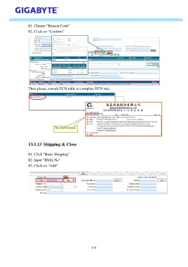 01. Choose “Reason Code” 02. Click on “Confirm” Then please consult ECN table to complete ECN rule. 13.1.13 Shipping & Close 01. Click “Basic Shipping” 02. Input “RMA No” 03. Click on “Add” 175