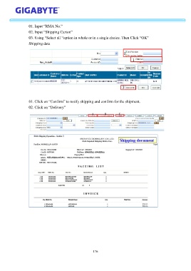 01. Input “RMA No.” 02. Input “Shipping Carton” 03. Using “Select all “option in whole or in a single choice. Then Click “OK” Shipping data 01. Click on “Confirm” to notify shipping and confirm for the shipment. 02. Click on “Delivery” 176