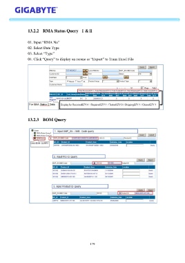 13.2.2 RMA Status Query Ⅰ&Ⅱ 01. Input “RMA No” 02. Select Date Type 03. Select “Type” 04. Click “Query” to display on serene or “Export” to Trans Excel File 13.2.3 BOM Query 179