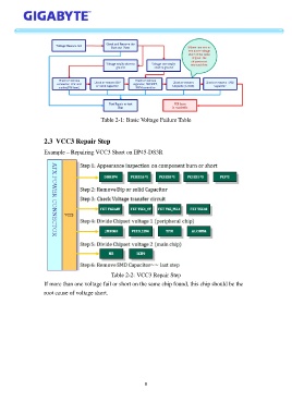 Table 2-1: Basic Voltage Failure Table 2.3 VCC3 Repair Step Example – Repairing VCC3 Short on EP45-DS3R Table 2-2: VCC3 Repair Step If more than one voltage fail or short on the same chip found, this chip should be the root cause of voltage short. 8