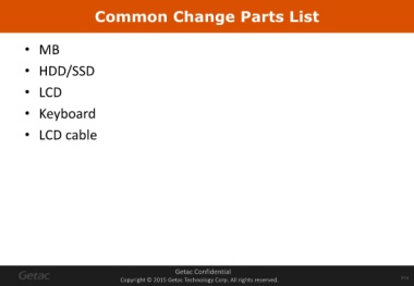 Common Change Parts List • MB • HDD/SSD • LCD • Keyboard • LCD cable Getac Confidential . Copyright © 2015 Getac Technology Corp. All rights reserved. P15 .