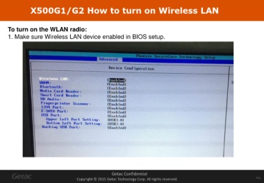 X500G1/G2 How to turn on Wireless LAN To turn on the WLAN radio: 1. Make sure Wireless LAN device enabled in BIOS setup. Getac Confidential . Copyright © 2015 Getac Technology Corp. All rights reserved. P24 .