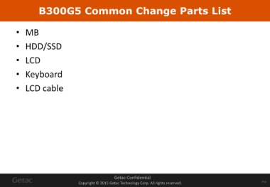 B300G5 Common Change Parts List • MB • HDD/SSD • LCD • Keyboard • LCD cable Getac Confidential . Copyright © 2015 Getac Technology Corp. All rights reserved. P44 .