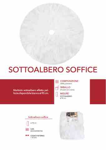 Morbido sottoalbero effetto pel- liccia disponibile bianco Ø 90 cm. SOTTOALBERO SOFFICE COMPOSIZIONE 100% poliestere IMBALLO 24 pezzi per scatola MISURE SOTTOALBERO: Ø 90 cm Sottoalbero soffice Ø 90 cm EAN 8059340985944 CODICE INTERNO 1-81256