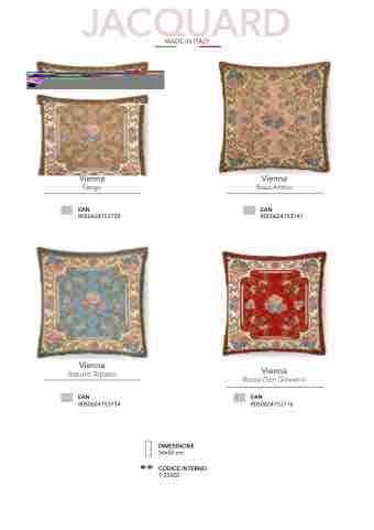 JACQUARD MADE IN ITALY Vienna Fango EAN 8050624753730 Vienna Rosa Antico EAN 8050624753747 Vienna Azzurro Topazio EAN 8050624753754 Vienna Rosso Don Giovanni EAN 8050624753716 DIMENSIONE 50x50 cm CODICE INTERNO 1-35002