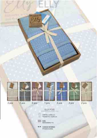 E EL L L L Y Y 2 pcs 1 pcs 2 pcs 1 pcs 2 pcs 2 pcs 2 pcs ELLY POIS OSPITE: 36X56 cm SALVIETTA: 53x96 cm EAN 8050506846116 CODICE INTERNO PF500213.0045