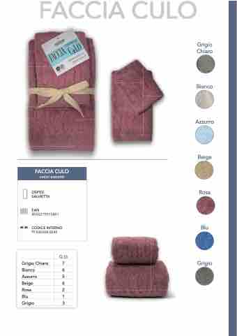 FACCIA CULO FACCIA CULO colori assortiti OSPITE SALVIETTA EAN 8056219015801 CODICE INTERNO PF500508.0045 Q.tà Grigio Chiaro Bianco Azzurro Beige Rosa Blu Grigio Grigio Chiaro 7 Bianco 6 Azzurro 5 Beige 6 Rosa 2 Blu 1 Grigio 3
