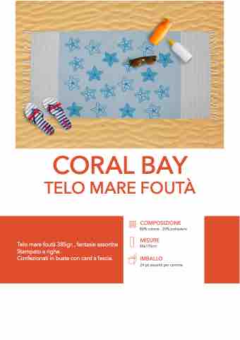 Telo mare foutà 385gr. , fantasie assortite Stampato a righe. Confezionati in busta con card a fascia. CORAL BAY TELO MARE FOUTÀ COMPOSIZIONE 80% cotone - 20% poliestere MISURE 90x170cm IMBALLO 24 pz assortiti per cartone