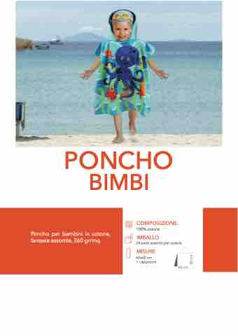 Poncho per bambini in cotone, fantasie assortite, 260 gr/mq. PONCHO BIMBI COMPOSIZIONE 100% cotone IMBALLO 24 pezzi assortiti per scatola MISURE 60x60 cm + cappuccio