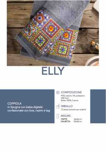 COPPIOLA in Spugna con balza digitale confezionate con box, nastro e tag ELLY COMPOSIZIONE 95% cotone, 5% poliestere 500 Gsm Balza 100% Cotone IMBALLO 12 pezzi assortiti per scatola MISURE OSPITE 36x56 cm SALVIETTA 53x96 cm