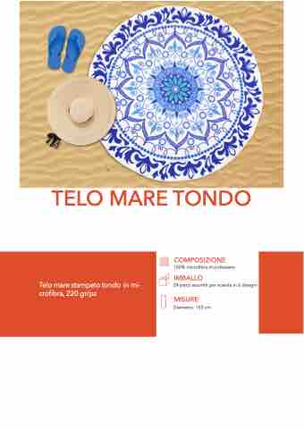 Telo mare stampato tondo in mi- crofibra, 220 gr/pz TELO MARE TONDO COMPOSIZIONE 100% microfibra di poliestere IMBALLO 24 pezzi assortiti per scatola in 6 disegni MISURE Diametro: 150 cm