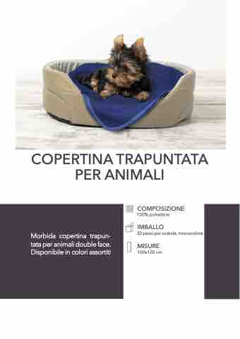 Morbida copertina trapun- tata per animali double face. Disponibile in colori assortiti COPERTINA TRAPUNTATA PER ANIMALI COMPOSIZIONE 100% poliestere IMBALLO 30 pezzi per scatola, monocolore MISURE 100x120 cm
