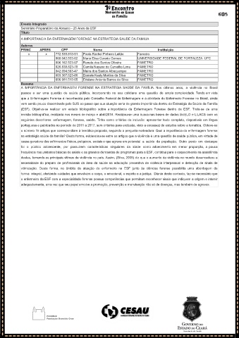 (ESF). Objetiva-se realizar um estudo bibliográfico sobre a importância da Enfermagem Forense dentro da ESF. Trata-se de uma