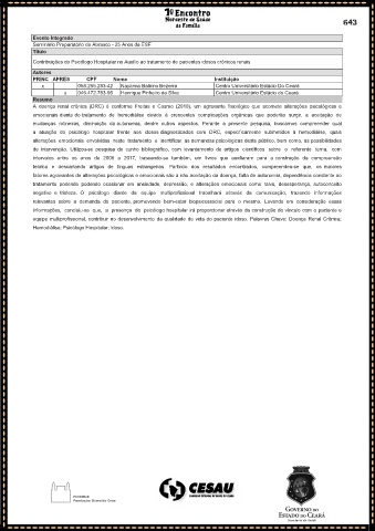 equipe multiprofissional, contribuir no desenvolvimento da qualidade de vida do paciente idoso. Palavras Chave: Doença Renal Crônica;