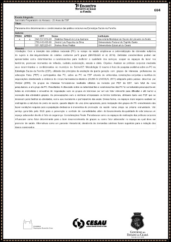 seus determinantes e condicionantes no município de Sobral/CE. Metodologia: O resumo é fruto de pesquisa avaliativa sobre as PC na