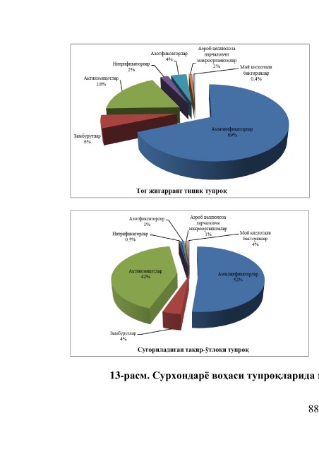 13-расм. Сурхондарё воҳаси тупроқларида микроорганизм гуруҳларининг тақсимланиши 88