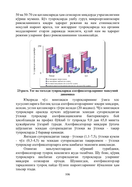 23-расм. Тоғ ва тоғолди тупроқларида азотфиксаторларнинг мавсумий