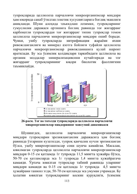 26-расм. Тоғ ва тоғолди тупроқларида целлюлоза парчаловчи