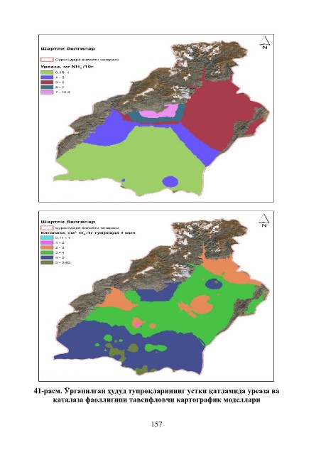 41-расм. Ўрганилган ҳудуд тупроқларининг устки қатламида уреаза ва каталаза фаоллигини тавсифловчи картографик моделлари 157
