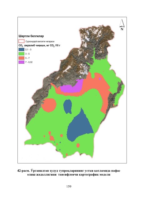 42-расм. Ўрганилган ҳудуд тупроқларининг устки қатламида нафас олиш жадаллигини тавсифловчи картографик модели 159