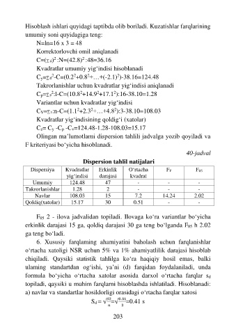 Olingan ma’lumotlarni dispersion tahlili jadvalga yozib qoyiladi va