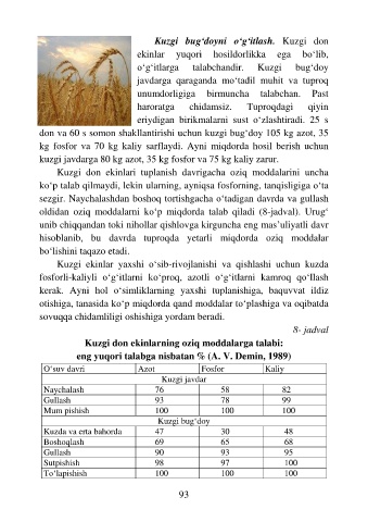 oldidan oziq moddalarni ko‘p miqdorda talab qiladi (8-jadval). Urug‘
