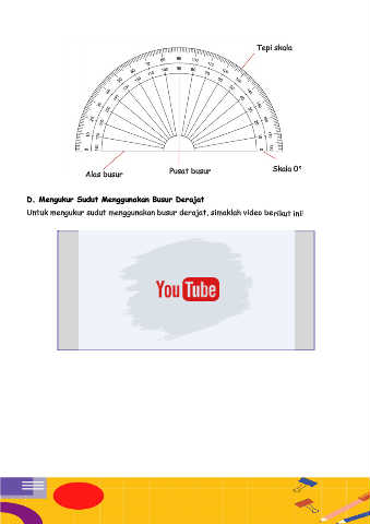 Tepi skala Alas busur Pusat busur Skala 0° D. Mengukur Sudut Menggunakan Busur Derajat Untuk mengukur sudut menggunakan busur derajat, simaklah video berikut ini!
