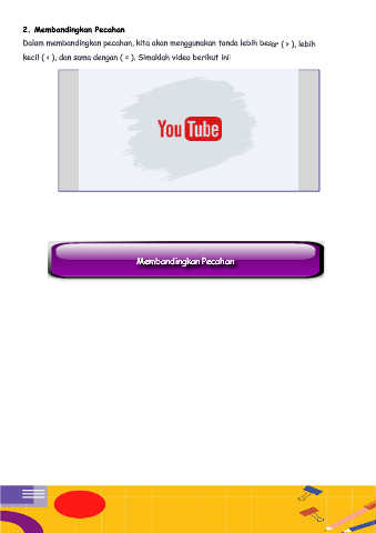 2. Membandingkan Pecahan Dalam membandingkan pecahan, kita akan menggunakan tanda lebih besar ( > ), lebih kecil ( < ), dan sama dengan ( = ). Simaklah video berikut ini! Latihan