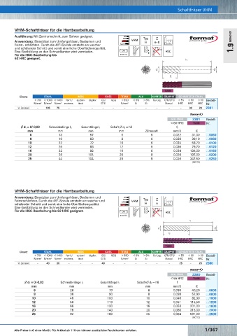 N/mm 2 N/mm 2 N/mm 2 martens. tisch GTS N/mm 2 Si Si Duropl. HRC HRC HRC Nr. ∅ d 1 = 0/-0,03 Schneidenlänge l 2 Gesamtlänge l 1 Schaft-∅ d 2 = h6 f z